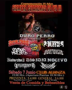 Este espectáculo de homenaje y conmemoración contará con las bandas: Duro Perro , Social Crisis, Barrio 357, Duff21 , Vecino Maldito, Sentencia, Nocivo, Disidia, Distorchon, Pressure y Yaldaboath